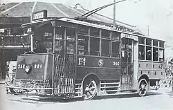 The route started operations on 15 November 1914 by the British-owned Shanghai Tramway Company, operating between Zhengjiamuqiao (郑家木桥, present day Middle Fujian Road & East Yan'an Road junction) and Laozhaqiao (老闸桥, present day Middle Fujian Road & East Beijing Road junction), with a total length of 1.127km. It was the first trolleybus route in Shanghai and also China, and is currently the oldest trolleybus route still operating worldwide.[2][3][4][5]