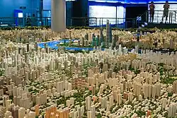 The Exhibition Center is a six-story building, with two basement levels, which displays Shanghai's urban planning and development. The focus of the exhibit is a large scale model of the entirety of urban Shanghai, showing existing buildings and approved future buildings. Other exhibits relate to Shanghai's history and planned development, including smaller scaled models focussing on particular areas of interest such as the Bund. The Exhibition Center also has space for temporary exhibitions with a wide range of subject matter.