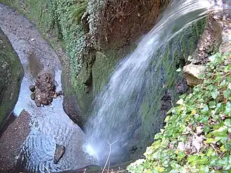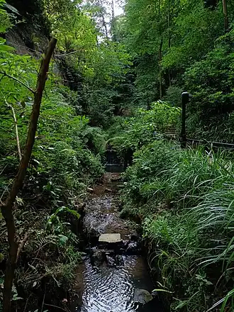 A chine is a local word for a stream cutting back into a soft cliff. Formation of the chine, which cuts through Lower Greensand Cretaceous sandstones, has taken place over the last 10,000 years. In the latter half of the nineteenth century, stones were laid at the top of the waterfall to arrest this progress. There are a continuous series of spring lines on the cliff faces in the chine. The Isle of Wight has a number of chines, but the largest remaining is Shanklin. With a drop of 32 metres (105 ft) to sea level, and a length of just over 400 metres (1,300 ft), the chine covers an area of approximately 1.2 hectares (3.0 acres).[1]