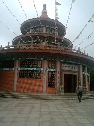 The museum covered an area of approximately 570 square metres (6,100 sq ft), with its main building, a three-storey pavilion, designed to resemble the Temple of Heaven in Beijing.[12][15] The main building housed hundreds of photos and drawings depicting events in the Cultural Revolution. It prominently featured Chairman Mao Zedong, who initiated the Cultural Revolution, and his last wife, Gang of Four member Jiang Qing.[11] Hundreds of gray granite slabs around the circumference of its inner walls had etchings of paintings from the two volumes of the book by Yang Kelin. Some paraphernalia such as little red books and Mao busts and badges were removed after some artifacts had disappeared.[7] A library inside the museum held nearly 300 books as of 2005.[8]