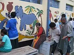 Lahiri was also involved in public art and graffiti art projects throughout Kolkata. Beginning in the 1980s, through her 'Love Calcutta Project' she encouraged street children and students to paint on the walls of Kolkata in an effort to beautify the city.[2][17] The previous decade had been a politically tumultuous one due to the Naxalite movement, which left the city's walls covered with political posters, slogans, and aggressive graffiti. In 1984[8] Lahiri gathered students of La Martiniere Calcutta to paint over their school wall with colourful art and murals. Gradually this movement caught on, and in the coming years she was involved in similar public art projects in various parts of the city such as Jadu Babu's Bazaar in the Bhowanipore area, the fish market at Sreebhumi, Fort William, and other areas in north and south Calcutta. Inspired by the folk dolls of Bengal, she created a statue of Parama on the Kolkata Bypass.[1][9]