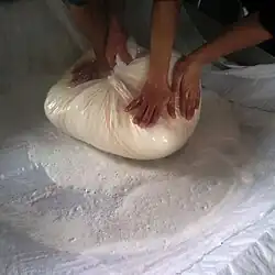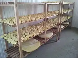 Total production of Sharr cheese is about 25 tones per year which is mainly produced in the region of Dragaš from sheep and cow milk. Main characteristics related to Sharr cheese is availability during all year, quality, saltiness and equal presentation in all regions of Kosovo.[11] While mostly produced in private households, the past decade has seen the rise of industrial Sharr cheese manufacturers. The majority of these entrepreneurs operate in and around Prizren, such as ABI Industry, a fruit and vegetable processing company which also makes this popular cheese. There is no significant difference between the traditional and industrial method of Sharr cheese production. The industrial version is made from pasteurized milk which is then fermented. Traditionally prepared cheese cannot be eaten until it has thoroughly absorbed the salt and has ripened, while industrially produced cheese is sent to the market after two weeks and can be eaten immediately. Veterans in industrial Sharr cheese production are the above-mentioned ABI and another Prizren factory – Sharri – which has been in this business for a decade. Sharr cheese is mostly sold across the region of the Western Balkans. However, since people from Kosovo live and work in Western Europe – for example in Germany and Switzerland – cheese manufacturers are visiting food fairs in these countries, hoping to enter the Western European markets.[7]