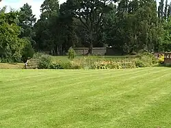 The garden is extensively planted with roses and traditional bedding flowers. Resting places, stepped terraces and ornate recesses are incorporated into the brick garden walls. A flint and brick circular summer house with a pointed tile roof sits in the far north corner and a raised terrace leads to a heavy wooden door in the far north wall. The north and west sides of the garden are bordered by woodland (part of Sharsted Wood) and a number of ancient trees are preserved within the grounds themselves. A small sunken pond also exists to the north of the house.