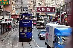 The road is shared by Hong Kong Tramways tram tracks.