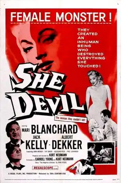 She Devil is a 1957 American widescreen science fiction horror film, shot in RegalScope, from Regal Films, that was produced, written, and directed by Kurt Neumann. The film stars Mari Blanchard, Jack Kelly, and Albert Dekker[1] and was theatrically released by 20th Century-Fox on a double bill with Regal's Kronos.[2][3]