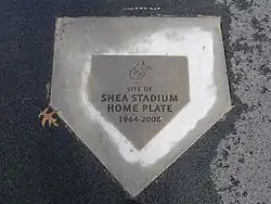 The locations of Shea's home plate, pitcher's mound, and bases are marked in Citi Field's parking lot. The plaques feature engravings of the neon baseball players that graced the exterior of the stadium from 1988 onward.[28]