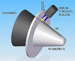 Shear forming, also referred as shear spinning, is similar to metal spinning. In shear spinning the area of the final piece is approximately equal to that of the flat sheet metal blank. The wall thickness is maintained by controlling the gap between the roller and the mandrel. In shear forming a reduction of the wall thickness occurs.
