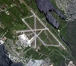 In approximately 1942 the aerodrome was listed as RCAF Aerodrome - Dartmouth, Nova Scotia at 44°38′N 63°30′W / 44.633°N 63.500°W with a variation of 23 degrees west and elevation of 141 ft (43 m). The field was listed as "all hard surfaced" and had four runways but only the first is readable as follows:[8]