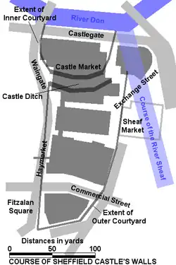 Sheffield Castle was located at the confluence of the River Sheaf and the River Don (53°23′5″N 1°27′48″W / 53.38472°N 1.46333°W), on the western bank of the Sheaf and the southern bank of the Don. The rivers provided defence to the north and east and there was a moat on the south and western sides of the castle.[2] This site was largely covered by Castle Market which was demolished in 2015.