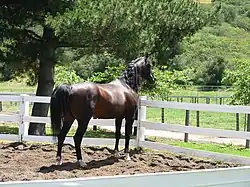 Subsequent generations of Varian stallions continued the pattern of winning in the show ring and then producing champion show horses across multiple disciplines. Huckleberry Bey was 1979 U.S. National Reserve Champion Futurity Stallion, 1981 U.S. National Top Ten Stallion, and 1984 U.S. National Reserve Champion English Pleasure. He then became the leading sire of US National Champions for five years, and in 1999 his likeness was reproduced as a Breyer horse model.[41][42] In turn, his son, Desperado V (× Daraska by Dar) became a leading sire of champions. In 2004 and 2005, Desperado V was ranked the leading Arabian sire by the United States Equestrian Federation (USEF),[43][44] and was second in 2008 and 2009. By 2009, Desperado V had sired 75 national winners.[45] In addition, another Huckleberry Bey son, Bravado Bey V (× Bachista V) was USEF's 10th-ranked leading Arabian sire in 2008.[46][47]