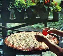 Stuffing is made of crumbled hazelnuts, ground cardamom and coriander seeds.[1][5] After placing 8–10 rishta layers on a round copper tray, the stuffing is added and then it is covered with 5–10 rishta layers.[5][3] The top layer is decorated with saffron in a square shape reminiscent of shabaka. It is generally baked over charcoal for 10–20 minutes.[3] Hot sherbet syrup is poured on Sheki halva before leaving it to rest over 8–10 hours.[1][3][4]