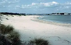 Shell Bay is a small bay in Dorset, England on the Studland peninsula. It is on the south side of the mouth of Poole Harbour and connected with Sandbanks by the Sandbanks Ferry which runs regularly across the entrance to the harbour and carries vehicles, foot passengers and cyclists. Bus number 50 (Bournemouth to Swanage) also stops at Shell Bay. The beach is an unspoilt sandy beach, backed by dunes and heathland. A couple of streams flow over the beach from the heathland inland of the beach. The beach offers wonderful views over the bay to nearby Bournemouth and is also a good view point for watching the ships passing in and out of Poole Harbour, including the Condor Ferries to the Channel Islands.