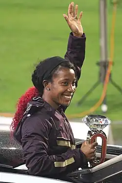 Fraser-Pryce registered the three fastest 100 m times of 2013 and the two fastest in the 200 m.[101] She won six Diamond League races throughout the season (four in the 100 m and two in the 200 m) to clinch the Diamond League titles for both events.[101] Owing to her achievements on the track throughout the season, she was named the IAAF World Athlete of the Year.[6][114] She is the second Jamaican woman to win this award after Merlene Ottey in 1990.[115]