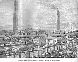 The main site began around 1830, was rapidly developed in the 1840s by the 4th Earl Granville[1] and his managing partner William Roden MP. In 1873 there were 93 puddling furnaces, 7 mills and 8 blast furnaces with extensive iron mines and collieries.[2] Many coal mines were sunk on the site, and railways built into the site which stretched from the western reaches of Hanley into Etruria as far as Middleport. In 1920 the company was acquired by John Summers & Sons,[3] who developed the site into an efficient modern steelworks. During World War II it was a frequent target for German bombers as it was impossible to fully blackout the light from the huge blast furnaces. Shelton Bar came under nationalised ownership in 1951, only to be denationalised by the Conservative government in 1953. The works was re-nationalised again in 1967 by the Labour Party and the main works was closed in 1978, after which the eastern 200 acres (0.81 km2) of the site was reclaimed for the 1986 National Garden Festival site, the Stoke-on-Trent Garden Festival.
