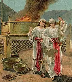 The Sin of Nadab and Abihu (illustration from a 1907 Bible card published by the Providence Lithograph Company)