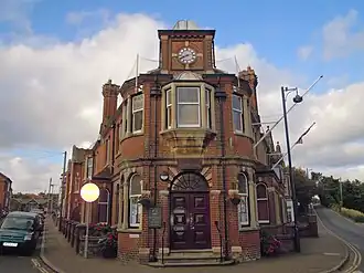 Following significant population growth, largely associated with the fishing industry, Lower Sheringham became an urban district in 1901.[1] In 1911, the new council decided to commission purpose-built council offices:[2] the site they selected was vacant land at the junction of Church Street and Saint Peter's Road.[3] The new building was designed by the local architects, Stanley Simons & Co., in the Edwardian style, built in red brick with stone dressings and was completed in 1912.[4][5]