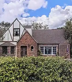 Although Tudor revival homes incurred greater expense to manufacture, they were popular and built in all sizes, including sprawling mansions and small cottages.[3] Most Tudor Revival homes, however, were large manors built in upscale neighborhoods. While the majority of Tudor Revival homes are located in the Northern United States since their facade is ideal for colder climates, the style did become popular in certain parts of Southern California, including such neighborhoods as Hancock Park and Windsor Square in the Wilshire District of Los Angeles. By the 1920s, Los Angeles became a mecca for aspiring craftspeople and artists, lured there by the motion pictures industry.[4] Flush with new wealth, movie moguls and stars sought luxurious living quarters befitting their new status, engendering an abundance of unique architectural revival styles in Los Angeles. Expansive, idealized versions of everything from Mediterranean villas to Spanish Missions and Greek Revival homes emerged. Storybook cottages provided a notable exception to the generous size generally required for revival architecture. Storybook cottages gained popularity in Southern California, though were rarely found anywhere else in the United States.[5] Although the building permit for this house did not require, hence did not list, an architect to be designated, it was most probably designed by the builder, Jack Frith. Frith acted as architect for a similar house in Tujunga, which he built as his own residence.[6]