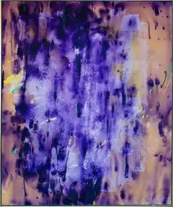 During the 1970s, she switched from bright hues to a more subdued palette and toward the end of the decade, she began to apply layers of impasto to her canvases.[6]: 5 [10] In 1978, a reviewer described her paintings of that time as having "clean, smooth curves of pure color against a densely mottled, deeply stained background texture."[10] At about this time, she began mixing gravel into her pigments and using spray guns to create random effects.[5][6]: 3