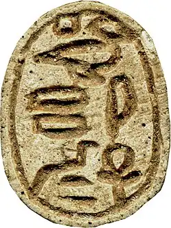 The nomen of Sheshi[note 4] is inscribed on over two hundred scarab seals, which constitute the sole attestations of his reign. The number of scarabs attributed to Sheshi is paralleled in number only by those bearing the prenomen Maaibre,[9] meaning "The righteous one is the heart of Ra".[7] Based on the close stylistic similarities between both groups of scarabs as well as their otherwise unmatched numbers,[10] the consensus among Egyptologists is that Maaibre was the prenomen of Sheshi.[8][9][11]