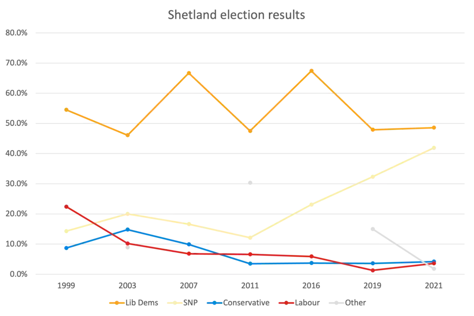 Shetland has been held by the Liberal Democrats at all elections since the formation of the Scottish Parliament in 1999, with the current MSP being Beatrice Wishart, who won the seat at a 2019 by-election held following the resignation of former party leader Tavish Scott.