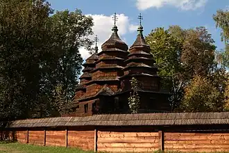 Among the 120+ architectural monuments from the western regions of Ukraine, six are wooden churches. The oldest exhibit is a peasant house from 1749.[19][20] Other notable buildings include a blacksmith's forge, a school, a sawmill, a fulling mill, a watermill, and a windmill.[21] The Museum of Folk Architecture and Life in Lviv is visited by over 300 thousand people every year.[22]