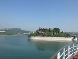 Shibaozhai (simplified Chinese: 石宝寨; traditional Chinese: 石寶寨; pinyin: shí bǎo zhài; lit. 'Precious Stone Fortress') is a hill along the bank of the Yangtze River (Chang Jiang) in Zhong County, Chongqing, China. This rocky and craggy hill has extremely steep sides and is about 200 meters (660 feet) tall. On the river side is a red pavilion which leans against the side of the hill providing a walkway to the temple at the top. The red pavilion built against the rock face is one of the largest wooden temples with nine floors. A yellow entrance at the base of the pavilion provides access.