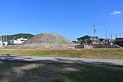 The Shiratorizuka Kofun (白鳥塚古墳) is the 3rd largest in Aichi Prefecture and dates from the late 4th century. The is one of several kofun in various locations which claim to be the grave of the semi-legendary folk hero Yamato Takeru. It is a zenpō-kōen-fun (前方後円墳), which is shaped like a keyhole, having one square end and one circular end, when viewed from above. No trace of haniwa has been discovered, but the tumulus was originally covered with fukiishi river stones, and white silica stones were used at the top of the posterior circular portion, giving the tumulus the appearance of a white bird. It maintained this appearance to the end of the Edo period, but most of the stones have since disappeared and only traces remain today. In the Taisho period a portion of the posterior circle collapsed by 1.8 square meters, and suspecting that this was the location of the burial chamber, a local antiquarian attempted an excavation, but there is no record of any findings. The tumulus was designated a National Historic Site in 1972. The tumulus has been surveyed by Nagoya University in 1969 and 2005, and it has been confirmed to have been built in two tiers in the anterior portion, and three tiers in the posterior portion. The interior has not be excavated. The anterior portion is distorted, but it was not determined if this was intentional, or due to erosion. Another survey in 1992 revealed the existence of a moat of the southeast side of the anterior portion, and the area covered under National Historic Site protection was expanded in 2008.[2]