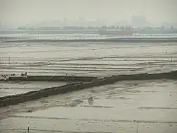 Further downstream, the Shijing River's estuary (the Anhai Bay) continues to exist. It is an important aquaculture area. As of ca. 2001, 138.5 hectares of the mudflats and water surface on the bay's western (Shuitou) side were used for aquaculture; this included 37.5 ha used for raising the blood cockles (Tegillarca granosa, 泥蚶), 58.3 ha used for the Chinese razor clam (Sinonovacula constricta, 缢蛏), 16.2 ha used for oyster farming, and 26.5 ha used for shrimp farming. Over 1400 people from Shuitou's Gangnei Village (巷内村) were employed in aquaculture and fishing.[2]