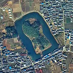 The Shimanoyama Kofun is a zenpō-kōen-fun (前方後円墳), which is shaped like a keyhole, having one square end and one circular end, when viewed from above. It is located on a slight elevation overlooking the Yamato River in the center of the Nara Basin and is one of the burial mounds that make up the northern group of the Umami Kofun cluster. It is about one kilometer east of the Ōtsukayama Kofun Cluster. The location of these tumuli is where the rivers of the Yamato Basin converge, and it is located at a key transportation point. As the shape and dimensions of the Kawai Otsukayama Tomb and the Shimanoyama Tomb are identical, these two tombs are thought to be closely related. [3]