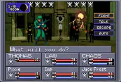 Battles are turn-based, and consist of players letting the characters in their party attack with swords or guns, summon demons, or cast magic spells; both demons and humans, with the exception of the player character, are able to use magic.[4][5] By participating in battles, human characters in the player's party receive experience points; by accumulating these points, the characters' levels rise and new abilities are randomly learned.[2] Players can choose to talk to demons instead of fighting them; they can ask the demons for items or money, try to get them to go away, or try to form an alliance with them. At some places, called "Cathedrals of Shadows", players can fuse two to three allied demons into one single, more powerful demon; as demons do not receive experience points, this is the only way for the player to increase their demons' power.[5][6] Magnetite is used as a fuel for allied demons, and is used up by summoned demons as the player character walks around in the dungeons; if players run out of magnetite, summoned demons take damage.[5]