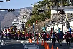 This is a three-day festival that starts on the first or second weekend of April. Takeda's death anniversary is on April 12. There's a reenactment of Takeda Shingen's Koshu Battalion Deployment. People dress in traditional and samurai costumes of the Sengoku Period. An actor plays Takeda Shingen and he is surrounded by his Twenty-Four Generals. After the Shingen-ko Tea Ceremony, Takeda leads his army through the streets of Kōfu. They march from the plaza in front of Kosu station through the streets of Kōfu to Maizuru Castle Park which contains the ruins of Kōfu Castle. On the third day they reach the Takeda Shrine (武田神社, Takeda Jinja). A Shinto ritual is held on the anniversary of Takeda Shingen's death.[1]