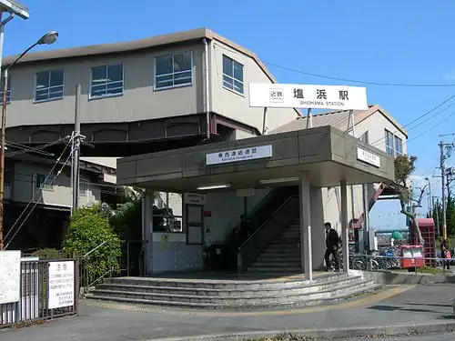 Shiohama Station opened on October 25, 1919 as a station on the Ise Railway. The Ise Railway became the Sangu Express Electric Railway's Ise Line on September 15, 1936, and was renamed the Nagoya Line on December 7, 1938. After merging with Osaka Electric Kido on March 15, 1941, the line became the Kansai Express Railway's Nagoya Line.[2] This line was merged with the Nankai Electric Railway on June 1, 1944 to form Kintetsu.[2] A new station building was completed on June 23, 1986.
