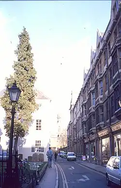 The street has had a number of names.[3] It was known as Dewy's Lane in the 13th century, after a family who lived there. Its name was Somenor's Lane in 1385. For a time the street was known by the name of Lawrence Hall, which was on the south side of the street, 30–40 yards from Turl Street.[4] The name of "Ship Street" was used from about 1762, after an alehouse in the street. At one time, there was a sheep market in the street and its name is a possible corruption of this. The street used to be much longer than it is today, running east through Catte Street to the city wall at Eastgate.