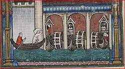 It was a type of watermill powered by water wheels mounted on the sides of vessels moored in midstream, preferably close to bridges where the current is stronger. From then on, the ship mill spread to Europe, reaching Paris (556), Geneva (563) and Dijon (c. 575).[3]