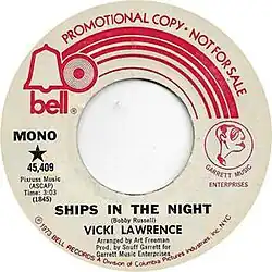 "Ships in the Night" is a 1973 song by American singer Vicki Lawrence. It was the first of two singles included on her 1974 Ships in the Night LP. It is a waltz done in 3/4 time.