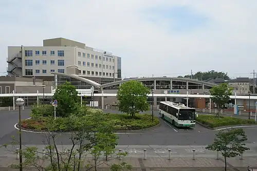 The station has two semi-underground side platforms and two tracks connected by an elevated station building The ticket gates and concourse are on the first floor, and the platform is below. There is only one ticket gate. Because it is semi-underground, there are tunnels on both sides of the station. The station building is designed to harmonize with the surrounding hills, making extensive use of gentle curves. Not only the station building but also the station sign features a gently curved flower design as the station logo. The walls are made of glass, giving the station a sense of openness. [2]