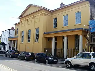 The new building was designed by Edward Haycock in the neoclassical style, built in ashlar stone with a stucco finish at a cost of £5,570 and was completed in 1829.[2] The design involved a symmetrical main frontage with nine bays facing onto Broad Street; the central section of three bays, which projected forward, featured three tall sash windows with blind panels above flanked by Tuscan order pilasters supporting a pediment. The outer sections featured ground floor loggias containing doorways in the inner bays and sash windows in the outer bays; the outer sections were fenestrated by sash windows on the first floor.[1] Internally, the principal rooms were the courtroom, the judge's lodging and the prison cells.[1]
