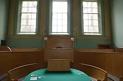 The shire hall in Preseigne continued to be used as a judicial facility for most of the 20th century: the last assizes were held in the building in 1970 and the last magistrates' court hearing took place in 1990.[2] When the magistrates left the courtroom, the fittings were left just as they had been with the judge's seat, the barristers' seats, the dock for the accused, the jury benches and the witness' benches all intact.[11] The public library, which had also been located in the building, moved to the market hall in 1996.[7]