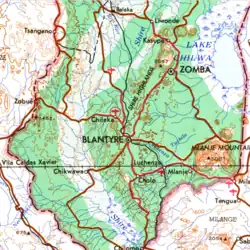 The northernmost portion of the plateau includes a line of hills – Chinduzi, Mongolowe, Chaone, and Chikala – that extend 40 km east and west. The taller Zomba Plateau south of them. The northern hills are made up of syenite and nepheline syenite, and the Zomba plateau is made up of syenite and quartz syenite, which intruded into the much older Precambrian igneous and metamorphic rocks that compose much of the highlands.[3] The central portion includes numerous hills and mountains, including Chiradzulu (1774 m), Ndirande (1613 m), Soche (1533 m), and Michiru (1474 m). Thyolo Mountain lies at the southern end of the highlands.[4]