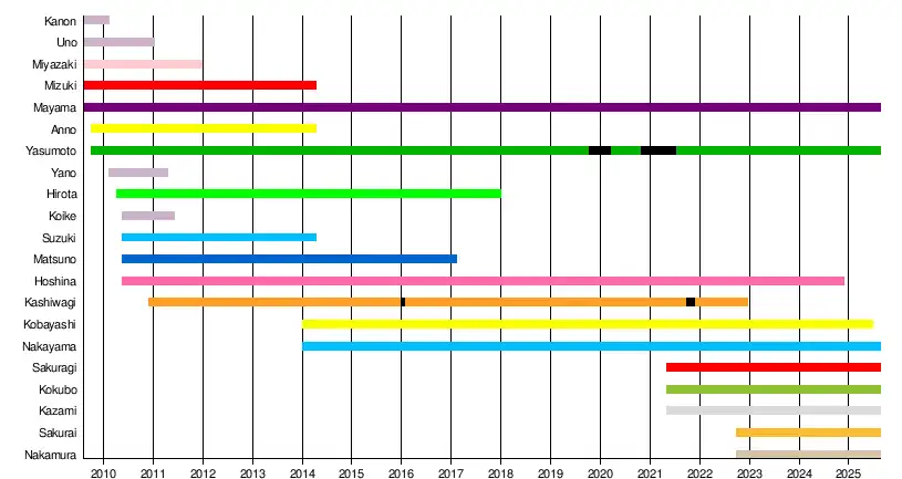 | Past members | Kanon Nanaki Narumi Uno Hinaki Yano Rio Koike Reina Miyazaki Mizuki Natsu Anno Hirono Suzuki Rina Matsuno† (deceased) Aika Hirota Hinata Kashiwagi Mirei Hoshina Kaho Kobayashi |