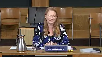 In the 2021 Scottish Parliament election, Somerville secured a second term as the MSP for the Dunfermline constituency.[15] The SNP fell two seats short of an overall majority in the election, however, remained the largest party, with more than double the seats of the Scottish Conservatives.[16] Sturgeon announced her intention to form a third administration and appointed Somerville as the Cabinet Secretary for Education and Skills, succeeding John Swinney, who was mounted with pressure by opposition to resign.[17][18][19][20] The general secretary of the Educational Institute of Scotland (EIS) Larry Flanagan welcomed her appointment, but added, "The first issue the Cabinet Secretary will need to address is an end to the scandal of temporary contracts throughout the education system.".[21]