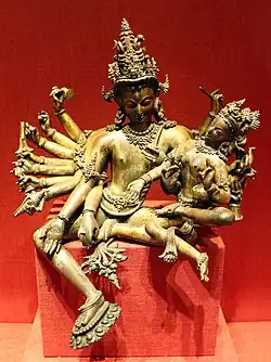 Present Maheśvara is Buddhist by religion, and was reborn as a Deva, because of his merit of donating a cup of honey to Kassapa Buddha in one of his previous lives. According to Karandavyuha Sutra, Maheśvara was born from the brow of Bodhisattva Avalokiteshvara.[1] According to Buddhist traditions, he helps good people, mostly who follow the Buddhist precepts and eat a vegetarian diet, and also punishes bad people for their evil deeds. He helps yogis doing Kundalini Meditation.[2][3] He is bodhisattva of Tenth Bhumi. He is one of the important deities venerated in Sri Lankan Buddhism. He is one of the twenty four protective deities of Chinese Buddhism and of the sixteen dharmapalas of Tibetan Buddhism.