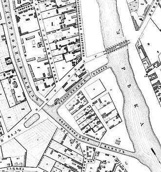In the 19th century the eastern end of Vodootvodny Canal was closed by a dam with locks, located about 150 meters west (upstream) from the tip of Balchug island. In 1930s, this dam was demolished as part of Moscow Canal project and replaced with a temporary bridge for trams and automobiles. This bridge was torn down upon completion of Bolshoy and Maly Krasnokholmsky Bridges (before World War II).
