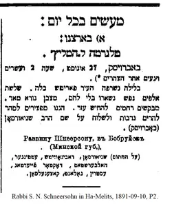 SchneersohnArticle reporting Scheersohn's death, 14 February 1923S. N. Schneersohn in Ha-Melits, 1891-09-10, P2.