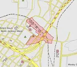 In the 1870s it came to be labeled on maps as Potter's Field, until it last appeared in 1905.[5][6] The 1905 map showed that it extended west behind The Almshouse to 2nd St, and north to the Bacon's Quarter Branch.[7] Some maps show it extending to the east almost as far as 8th St. Earlier maps show it by various names. On the 1816 Plan of the City of Richmond Property, the two one-acre plots were labeled "Burying Ground for Free People of Colour", and the "Burying Ground for Negroes".[2] On the 1817 Map of the City of Richmond, it appears as the "Free People of Colour's B.G." and "Negro(e's) B.G.".[8] The 1835 Plan of the City of Richmond has it recorded as the "Grave Yard for Free People of Colour" and "For Slaves".[9] On that map the burying ground for slaves had been increased by about 1.3 additional acres. The 1842 Bates Map depicts it as "The Burying Ground for Coloured Persons" and "the Burying Ground for Slaves".[10] On the 1849 Plan of Richmond, it is referred to as one place, and was called the "Burying-ground for Coloured Persons".[11] In 1850 the Common Council increased the burying-ground for colored persons by 9 acres in addition to the grounds of the City Hospital.[12] On the 1853 Smith's Map of Henrico County, Virginia, it appears twice. On the county portion of the map it appears under the "Shockoe Hill Burying Ground". On the separate city of Richmond portion of the map it appears as the "African Burying Ground".[13] On the 1856 Map of the city of Richmond, Henrico County, the entire burying ground (black and white) appears under one name, without the additional labels showing its segregated status. Though still segregated, it appears simply as the "Shockoe Hill Burying Ground".[14] This is also the name under which it appears in the majority of records, such as interment reports.[15][16] It is also true for some maps from the 1860s.[17] However; it is from the combination of the two names under which it appears on the 1853 Map that the name "Shockoe Hill African Burying Ground" was derived.