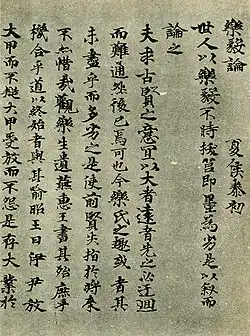 In the 7th century, the Tang dynasty established hegemony in China. Their second Emperor Taizong esteemed Wang Xizhi's calligraphic texts and this popularity influenced Japanese calligraphers. All of the original texts written by Wang Xizhi have been lost, and copies such as Gakki-ron (楽毅論) written by the Empress Kōmyō are highly regarded as important sources for Wang Xizhi's style. However Wang's influence can barely be overstated, in particular for the wayō (和様) style unique to Japan: "Even today, there is something about Japanese calligraphy that retains the unchanged flavour of Wang Xizhi's style".[9]