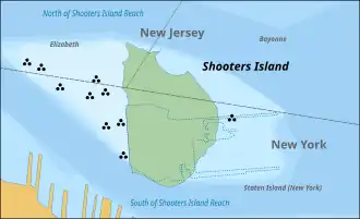 Shooters Island is a 43-acre (17 ha) uninhabited island at the southern end of Newark Bay, off the North Shore of Staten Island in New York City.[1] The boundary between the modern states of New York and New Jersey runs through the island, with a small portion on the north end of the island belonging to the nearby cities of Bayonne and Elizabeth in New Jersey and the rest since 1898, as a part of the borough of Staten Island in New York City of New York state.