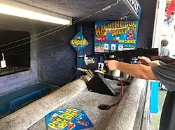 The first version of the game was called "Mow 'Em Down" and featured a pneumatic machine gun resembling a water cooled heavy machine gun and was invented in 1939.[4] Later Feltman modified the design to resemble a Thompson submachine gun with a patent granted in 1941[5] The weapon fires 100 .150 BBs, made of #2 lead shot. Later, a "Combat" variant was introduced, which crudely resembles a Colt AR-15.