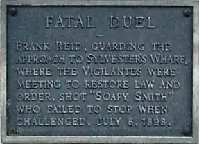 Reid, a 54-year-old resident of Oregon, had worked as a bartender in the Klondike Saloon, a gambling den under Smith's control. He became the city engineer and operated lot sales to miners.[16] Tanner was a 48-year-old captain of barges and steamers to and from Skagway;[17] after the shootout, he was appointed a Deputy U.S. Marshal.[18] Jesse Murphy was an Irish employee of the newly arrived White Pass and Yukon Railway.[19] Very little is known of John Landers.