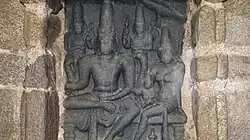 The most distinctive feature of the temple are the Dharalinga and the Somaskanda panel, which are enshrined in the interior walls of the sanctum of the east facing Kshatriyasimhesvara temple. The Dharalinga is deified in the garbhagriha, which is in square shape of 12 feet (3.7 m) and the height is 11 feet (3.4 m). The Dharalinga or Shivalinga is in Rajasimha style, carved out of black basalt stone. It has sixteen faces with slight fluting to create a crown at the top. The top portion of the linga is damaged. Its total height is 6 feet (1.8 m) with one foot embedded in the foundation to provide stability.[5] A bas-relief, which is a family image of Shiva and his consort Parvati with their child Kartikeya built over a stone slab is located in a small shrine in the temple. This is also called the Somaskanada panel, a carved stone panel. Two more similar panels are seen at the entrance porch of the temple. This type of panel is also depicted in the nearby Dharmaraja Ratha of the Paramesvarvarman's era.[5][13][14] The ardhamantapa or half chamber which is the first chamber before entering the sanctum sanctorum, also has sculptures of Brahma on the south wall and Vishnu on its north wall. Sculptures of Shiva as Tripurantaka and Durga are seen on the back side of the north wall of the main shrine. There is also a circumambulatory passage to go round the main shrine in a clockwise direction.[5]
